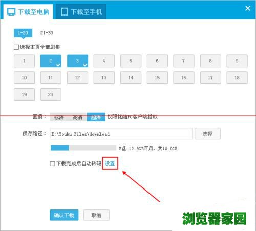 2、在弹出的下载窗口中,先勾选好集数,然后点击超清,(PS:需先登录优酷帐户)接着点击下方的“ 设置 ”选项。
