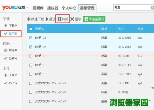 1、如果你在下载前,忘记勾选设置自动转码了,那么也是可以从“已下载”这里进行手动转码。步骤如下,在已下载页面“勾选”需要转码的影片,然后点击上方的“转码”按钮。