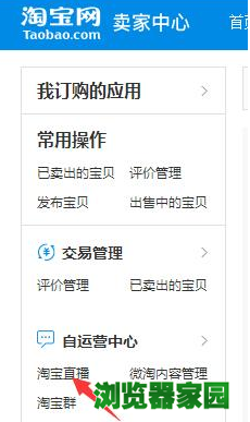 进入到卖家中心后,在左侧的导航中,选择自运营中心下的淘宝直播的选项进入。